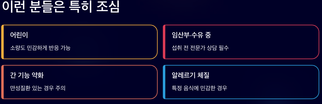 - 어린이(소량도 민감하게 반응할 수 있음)