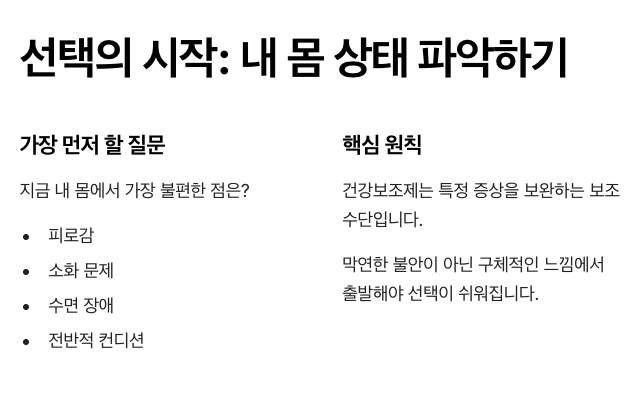 결국 건강보조제는 생활을 대신해주는 존재가 아니라, 옆에서 도와주는 역할에 가깝습니다. 이 점을 잊지 않으면 선택도, 관리도 훨씬 편안해집니다. 증상이 지속되면 전문 상담이 필요할 수 있어요.