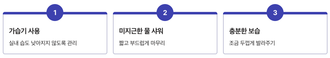 - 실내 습도가 너무 낮아지지 않도록 가습기를 활용해요.