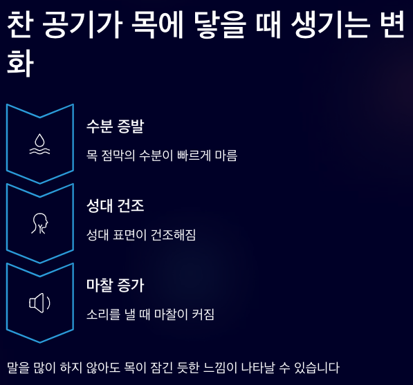 목과 성대는 숨을 쉬고 말을 하는 과정에서 외부 공기와 직접 맞닿는 부위입니다. 특히 겨울처럼 차고 건조한 공기가 반복적으로 지나가면, 목 점막은 쉽게 건조해지고 예민해질 수 있습니다.