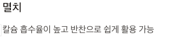 - 멸치: 칼슘 흡수율이 높고 반찬으로 쉽게 활용 가능