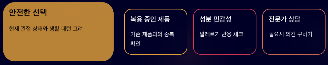 관절보궁 효능을 살펴볼 때는 현재 관절 상태와 생활 패턴을 함께 고려하는 것이 중요합니다. 기존에 복용 중인 제품이 있거나 특정 성분에 민감한 경우에는 성분 확인과 전문가 상담을 함께 고려하는 편이 안전합니다.