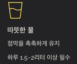 - 하루 1.5~2리터 이상 충분한 수분 섭취 필수