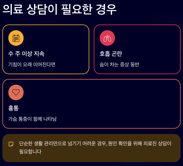 기침이 수 주 이상 이어지거나 숨이 차고 흉통이 함께 나타난다면 단순한 생활 관리만으로 넘기기에는 무리가 있습니다. 이 경우 원인 확인을 위해 의료진 상담이 필요할 수 있습니다. 민간요법이나 음식에 과도한 기대를 두기보다는 보조적인 방법으로만 활용하는 것이 안전합니다.