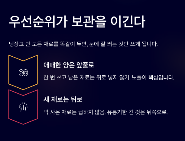 냉장고 안에 모든 재료를 똑같이 두면, 결국 눈에 잘 띄는 것만 쓰게 됩니다.