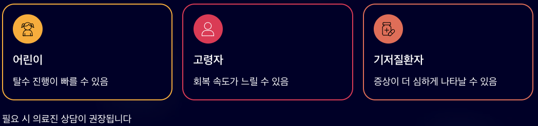 노로바이러스 잠복기 이후 증상이 시작되면 탈수 위험을 함께 살펴봐야 합니다. 구토와 설사가 반복되면 수분 손실이 빨라질 수 있기 때문입니다. 특히 어린이나 고령자, 기저질환이 있는 경우에는 증상이 더 불편하게 느껴질 수 있어 필요 시 의료진 상담이 권장되기도 합니다.
