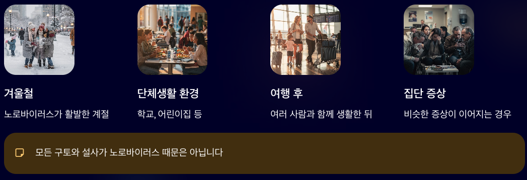 노로바이러스 잠복기는 개인의 면역 상태나 컨디션에 따라 차이가 있을 수 있습니다. 같은 공간에 있었어도 어떤 사람은 빨리 증상이 나타나고, 다른 사람은 하루 이상 지난 뒤에 불편함을 느끼기도 합니다.