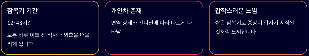 노로바이러스 잠복기는 보통 12시간에서 48시간 정도로 알려져 있습니다. 이 기간이 길지 않다 보니, 하루 이틀 전의 식사나 외출을 떠올리게 되는 경우가 많습니다. 그래서 증상이 갑자기 시작된 것처럼 느껴지기도 합니다.