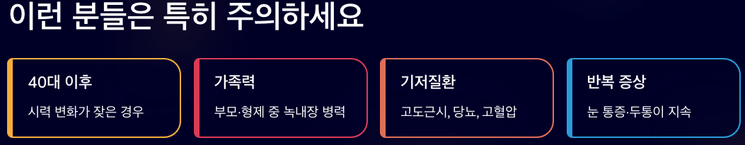 녹내장 초기증상은 대부분 미묘하고 서서히 나타나기 때문에 쉽게 놓치기 쉽습니다. 눈이 자주 피로하거나, 시야가 답답해지는 느낌이 반복된다면 단순 노안으로만 넘기지 말고 한 번쯤 검진을 받아보는 것이 안전합니다. 녹내장은 조기 발견이 시력을 지키는 가장 중요한 열쇠입니다.