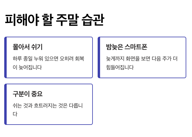 많은 사람들에게 알려진 흐름을 기준으로 보면 주말에 모든 피로를 몰아서 푸는 방식은 오히려 회복을 늦출 수 있습니다. 하루 종일 누워 있거나 밤늦게까지 스마트폰을 보는 습관도 다음 주를 더 힘들게 만듭니다. 쉬는 것과 흐트러지는 것은 다르다는 점을 구분하는 것이 중요합니다.
