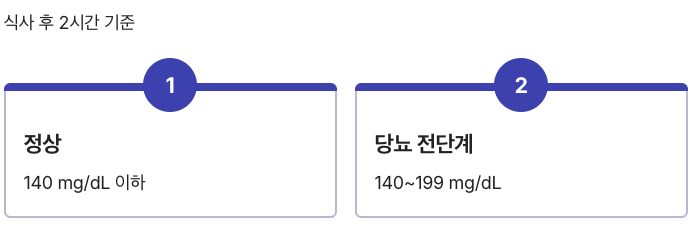 - 정상: 식후 2시간 기준 140 mg/dL 이하
