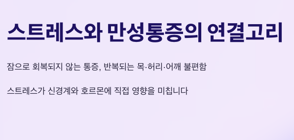 예전에는 잠만 푹 자면 괜찮아지던 통증이 어느 날부턴가 오래 머무를 때가 있습니다. 별다른 사고도 없었는데 목·허리·어깨처럼 익숙한 부위가 계속 아프고, 조금 나아지다가 다시 시작되는 식이죠. 이쯤 되면 ‘혹시 스트레스 때문인가?’ 하는 생각이 어깨 너머로 스치곤 합니다. 사실 많은 분들이 겪는 만성통증에는 스트레스가 아주 깊게 자리 잡고 있습니다. 단순히 심리적인 문제라서가 아니라, 몸속 신경계와 호르몬 흐름이 그대로 영향을 받기 때문이에요.