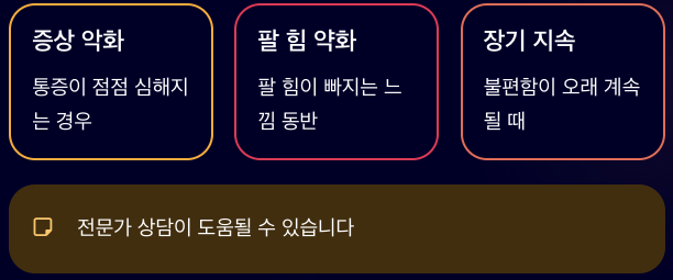 목디스크 증상이 점점 심해지거나, 통증과 함께 팔 힘이 빠지는 느낌이 동반된다면 다른 원인이 함께 작용했을 가능성도 고려해볼 필요가 있습니다. 또한 불편함이 장기간 지속될 경우에는 혼자 판단하기보다 전문가 상담이 도움이 될 수 있습니다. 목디스크 증상은 사람마다 양상과 정도가 다를 수 있다는 점도 중요합니다.