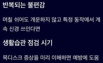 목디스크 증상은 하나의 원인으로 단정되기보다 자세 습관, 사용 패턴, 회복 상태가 함께 작용해 나타나는 경우가 많습니다. 요즘 목이 자주 뻐근하고 예전 같지 않다면, 몸이 보내는 신호로 받아들이고 생활 습관을 점검해보는 계기로 삼아볼 수 있습니다.