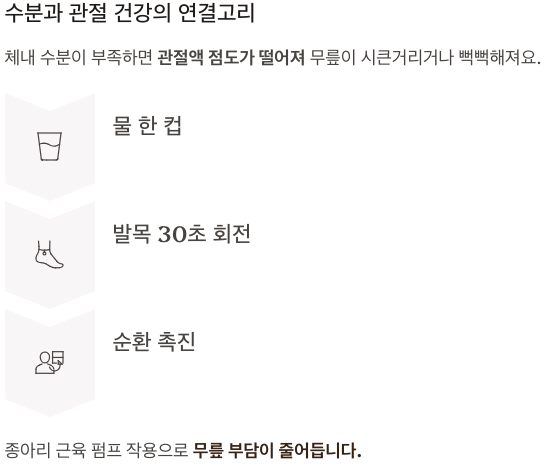 생각보다 많은 분들이 간과하지만 관절 건강은 체내 수분과도 밀접하게 연결돼 있어요. 체내 수분이 부족하면 관절액 점도가 떨어져 무릎이 시큰거리거나 뻑뻑해지기 쉽습니다. 따라서 물 한 컵을 먼저 마시고, 발목을 좌우로 30초씩 돌려주면 다리 전체의 순환이 촉진돼 무릎 부담도 줄어들어요.