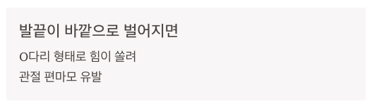 → 무릎이 과하게 펴지면서 충격이 증가해요. - 발끝이 바깥으로 벌어지는 걸음