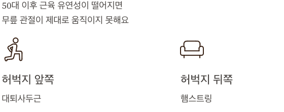50대 이후에는 근육 유연성이 급격히 떨어지기 때문에, 허벅지 앞·뒤 근육이 뻣뻣해지면 무릎 관절이 제대로 움직이지 못해 통증이 쉽게 생겨요.