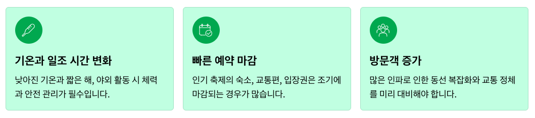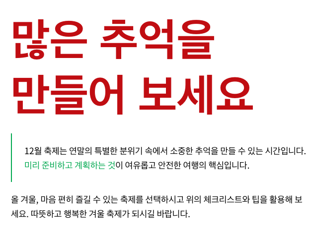 올 겨울, 마음 편히 즐길 수 있는 축제를 선택하시고, 위 체크리스트와 팁을 참고해 보세요. 좋은 추억이 하나 더 생기시길 바랍니다.
