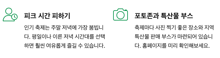 • 포토존이나 특산물 부스도 확인: 축제마다 ‘사진 찍기 좋은 장소’나 지역 특산물 판매 부스가 준비된 경우가 많습니다. 축제 홈페이지나 안내서를 미리 살펴보면 좋습니다.