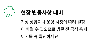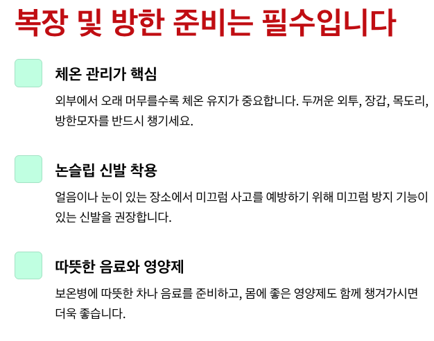 • 복장 및 방한 준비: 외부에서 머무는 시간이 길어질수록 체온 관리가 중요합니다. 두꺼운 외투, 장갑, 목도리, 방한모자 등을 갖추시길 권합니다.