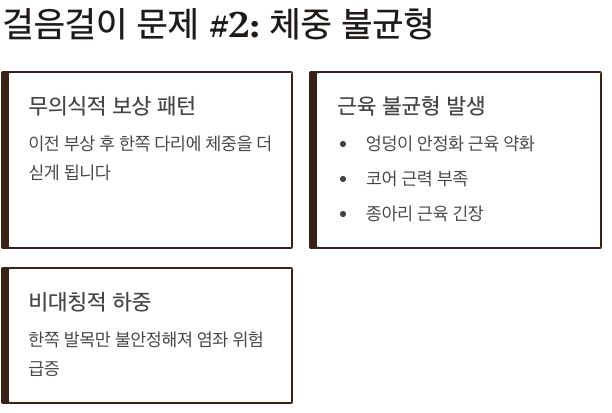 이전 부상 이후 무의식적으로 한쪽 다리에 체중을 더 싣는 사람들이 많습니다. 이는 발목 관절에 비대칭적인 하중을 유발하게 됩니다. 엉덩이 안정화 근육의 약화, 코어 근력 부족, 종아리 근육의 긴장 등도 이러한 비대칭적인 움직임을 초래할 수 있습니다.