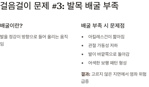 배굴은 발을 정강이 방향으로 들어 올리는 움직임입니다. 발목에 충분한 배굴이 부족할 경우(보통 아킬레스건이 짧거나 관절 가동성이 떨어질 때), 발은 걷는 도중 바깥쪽으로 돌아가거나 어색하게 회전하며 보행하게 됩니다.