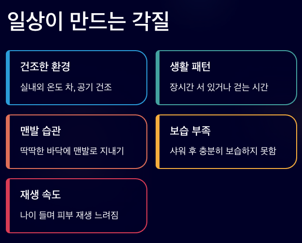 발뒤꿈치 각질 원인은 피부 하나의 문제가 아니라, 생활 환경과 몸 상태가 함께 만들어낸 결과일 수 있습니다. 그래서 관리보다 먼저, 지금 내 몸이 어떤 조건에 놓여 있는지를 살펴보는 과정이 필요합니다.