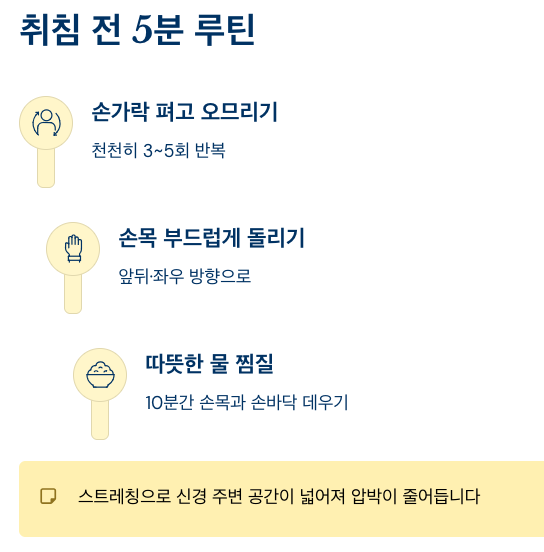 하루 중 손을 쉬게 하는 시간, 따뜻한 관리, 스트레칭을 꾸준히 시행하면 점차 편안해지는 변화를 느낄 수 있습니다.