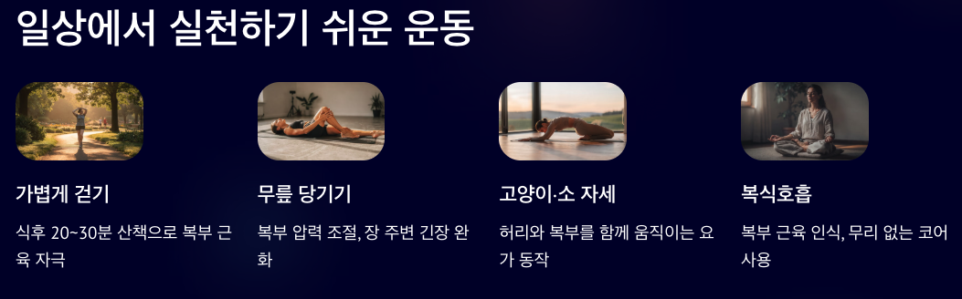 장은 스스로 움직이는 기관이지만, 생활 습관에 따라 그 리듬이 느려질 수 있습니다. 특히 오래 앉아 있는 시간이 많아지면 복부와 골반 주변 근육 사용이 줄어들면서 배변 리듬도 흐트러질 수 있습니다. 그래서 식습관 조절과 함께, 장의 움직임을 도와줄 수 있는 가벼운 운동이 함께 언급되는 경우가 많습니다.