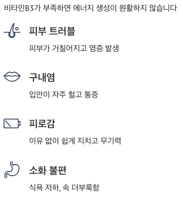 비타민B3가 부족하면 에너지 생성이 원활하지 않아 피로와 피부 문제 등이 나타날 수 있습니다. 다만 증상만으로 단정하기는 어렵기 때문에 지속된다면 전문 상담이 필요합니다.