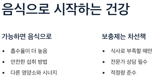 A. 가능하면 음식으로 섭취하는 것이 흡수율도 높고 안전합니다. 식사로 충분하지 않을 경우 전문가 상담 후 보충제를 고려하시면 됩니다.