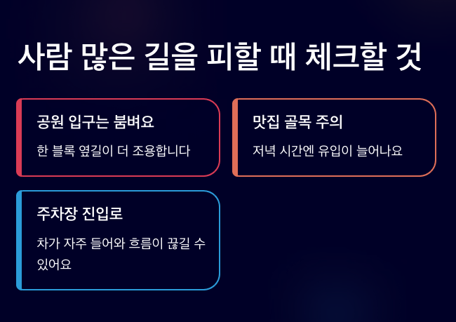 ‘조용한 길’이라고 해서 꼭 외진 곳일 필요는 없어요. 저는 오히려 사람이 적지만 안전한 길이 가장 중요하다고 생각해요. 그래서 기준을 몇 가지로 정해두면, 오늘 컨디션이 어떤 날이든 코스 선택이 편해집니다. 그리고 이 기준은 지역이 어디든 크게 달라지지 않아요.