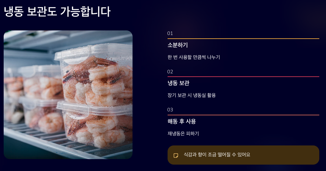 장기간 보관해야 한다면 냉동도 가능합니다. 다만 완전히 얼리면 식감과 향이 조금 떨어질 수 있어요. 한 번에 사용할 만큼씩 소분해 냉동하고, 해동 후에는 다시 냉동하지 않는 것이 좋습니다.