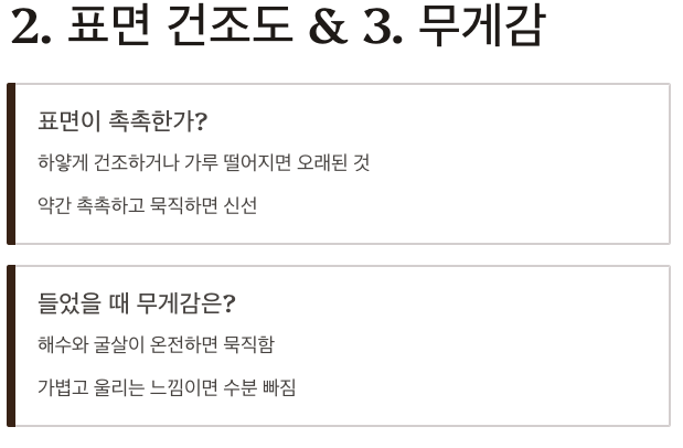 석화는 외부 수분이 어느 정도 유지된 상태가 가장 이상적입니다. 껍데기 표면이 너무 하얗게 건조하거나 분가루처럼 가루가 많이 떨어진다면 오랜 시간 유통되었을 가능성이 높습니다. 반대로 표면이 약간 촉촉하고 무게가 묵직하게 느껴지는 석화는 수분을 잘 유지하고 있어 내부 굴살도 탄력 있게 보존된 상태일 확률이 높습니다. 굴은 건조해질수록 살이 수축돼 맛과 식감이 급격히 떨어지니 이 부분을 꼭 확인하는 것이 좋습니다.
