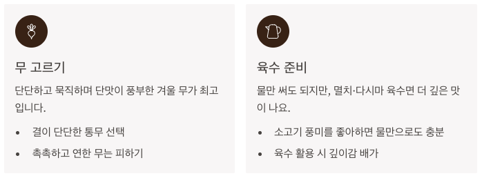 무는 한겨울 제철 무처럼 단단하고 묵직하며 단맛이 풍부한 것이 좋습니다. 촉촉하고 연한 무를 사용하면 국물 맛이 쉽게 흐려질 수 있으니, 결이 단단한 통무를 골라야 합니다.