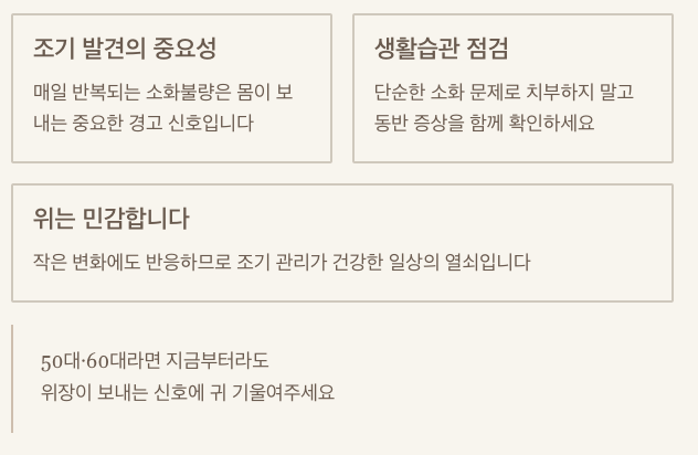 특히 50대 60대라면 단순한 소화 문제로 치부하지 말고, 생활습관과 동반 증상을 함께 점검해보는 것이 필요합니다. 위는 작은 변화에도 민감하게 반응하기 때문에, 조기에 신호를 파악하고 관리하면 건강한 일상을 되찾는 데 큰 도움이 됩니다.