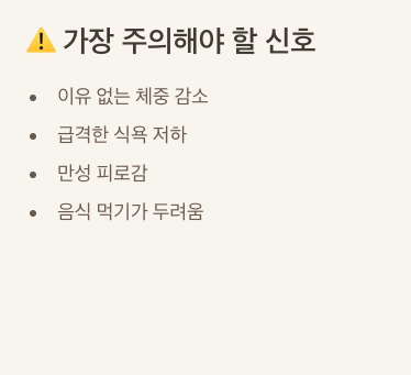가장 주의해야 할 위장 신호는 체중 감소, 식욕 저하, 만성 피로입니다.