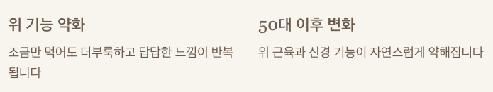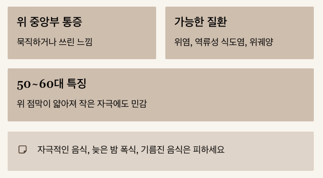특히 50~60대는 위 점막이 얇아지고 회복 속도가 늦기 때문에 작은 자극에도 통증이 반복될 수 있습니다. 이런 경우에는 가급적 자극적인 식사, 늦은 밤 폭식, 기름진 음식만큼은 피하셔야 합니다.