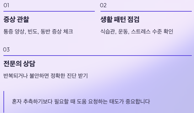 가슴 통증이 반복되는 상황이라면 먼저 현재의 생활 패턴을 조용히 들여다보는 것이 좋습니다. 너무 늦은 시간 기름진 음식을 자주 먹거나, 식사 후 바로 눕는 습관은 위산이 역류하면서 가슴 쪽 불편을 유발할 수 있어 어느 정도 조절이 필요합니다. 규칙적인 식사와 과식 피하기, 잠들기 전에는 속을 조금 가볍게 유지하는 정도만으로도 가슴 통증이 줄어드는 분들도 있습니다.