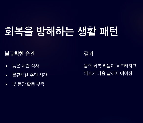 회복이느린습관을 가진 사람들의 공통점을 보면, 하루의 흐름이 일정하지 않은 경우가 많습니다. 늦은 시간까지 이어지는 식사, 불규칙한 수면 시간, 낮 동안 거의 움직이지 않는 생활이 겹치면서 몸의 회복 리듬이 흐트러집니다. 일반적으로 알려진 가이드라인 범위를 보면, 이런 패턴은 몸이 스스로 정리할 시간을 빼앗는 요인이 됩니다. 그 결과 피로가 다음 날까지 이어지게 됩니다.