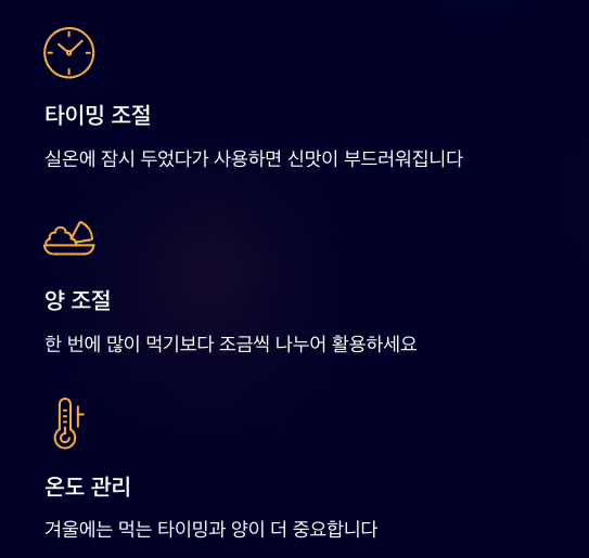 - 차갑게 먹으니 신맛이 더 강하게 느껴진다
