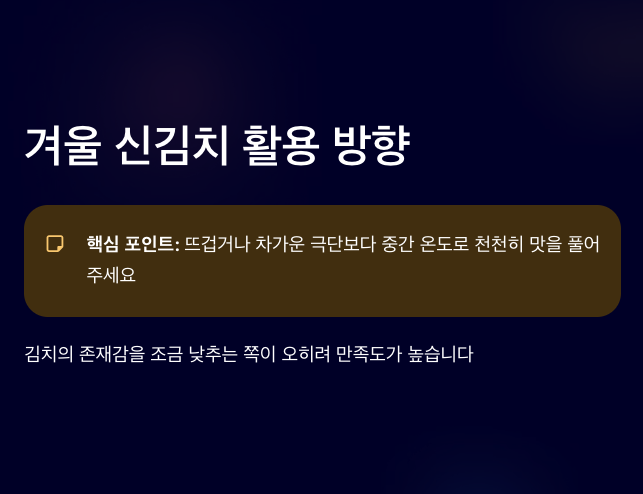 겨울에는 뜨겁거나 차가운 극단적인 조리보다, 중간 온도로 천천히 맛을 풀어주는 방식이 잘 어울립니다. 신김치요리는 거창할 필요 없이, 김치의 존재감을 조금 낮추는 쪽이 오히려 만족도가 높습니다.