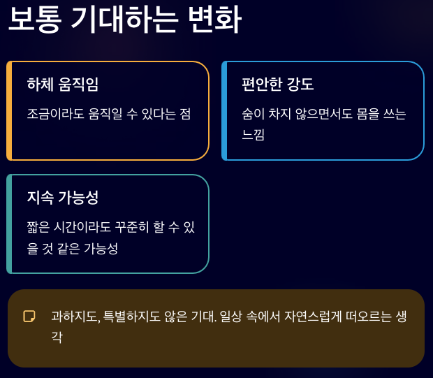 - 숨이 차지 않으면서도 몸을 쓰는 느낌