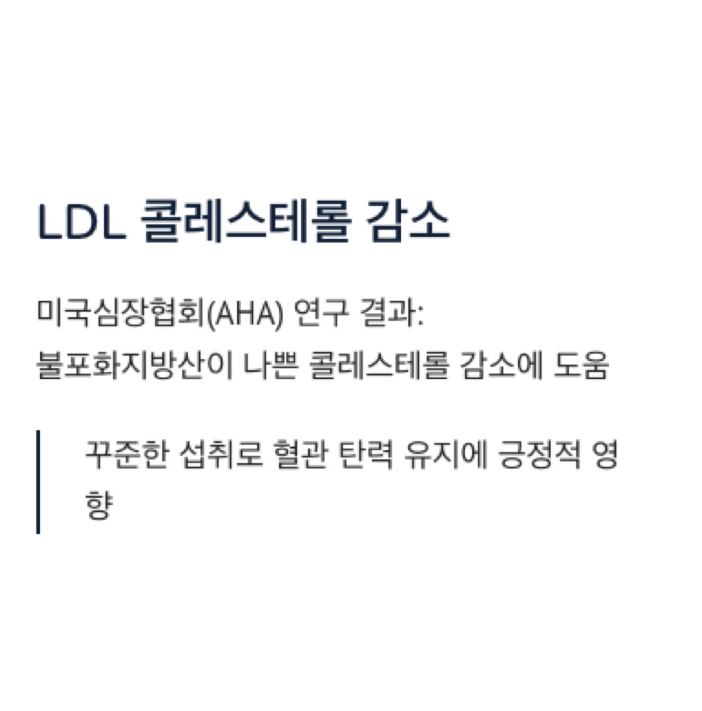 • 과학적 근거: 미국심장협회(AHA)는 단일불포화지방산이 LDL 콜레스테롤을 낮추는 데 도움을 줄 수 있다고 밝혔습니다.