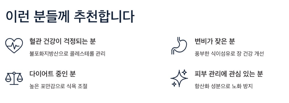 • 과학적 근거: 식이섬유는 장내 유익균 증식과 배변 활동 개선에 도움을 줍니다.