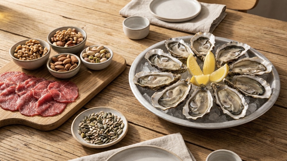 아연은 음식으로 섭취하는 것이 가장 기본입니다. 하루 식단에 단백질 식품과 함께 포함시키면 흡수율을 높이는 데 도움이 됩니다.