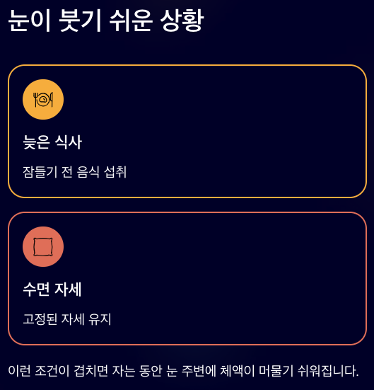 이런 조건이 겹치면 자고 있는 동안 눈 주변에 체액이 머물기 쉬워집니다.