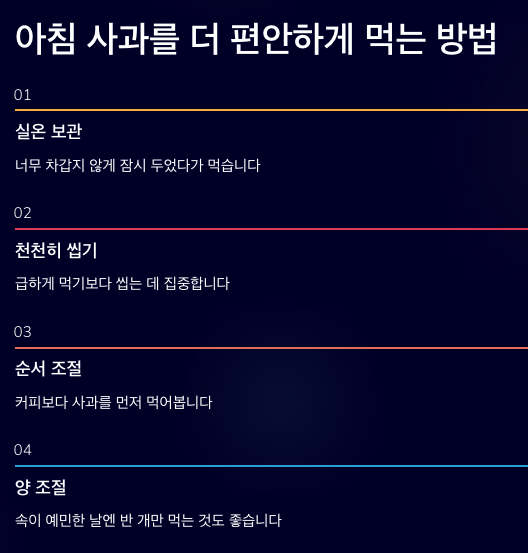아침 식습관은 하루 전체에 영향을 줍니다. 그래서 완벽한 식단보다, 내 몸에 맞는 작은 루틴 하나가 더 오래 가는 경우가 많습니다. 사과는 그런 루틴의 시작점으로 부담이 적은 선택입니다.