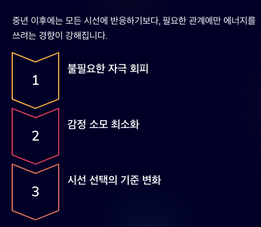 중년 이후에는 모든 시선에 반응하기보다, 필요한 관계에만 에너지를 쓰려는 경향이 강해집니다.