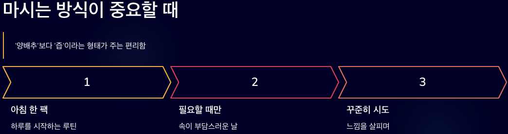 양배추즙은 ‘양배추’라는 재료 자체보다도, ‘즙’이라는 형태가 주는 편리함 때문에 선택하는 분들이 많습니다. 그래서 양배추즙의 효능을 생각할 때도, 내 생활 속에서 무리 없이 계속할 수 있는지 여부가 더 크게 다가오기도 합니다.